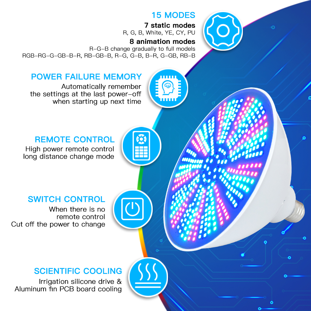 - 15 color modes, Including color transition, color fade, color changing and color jump. Enjoy the colorful pool now.