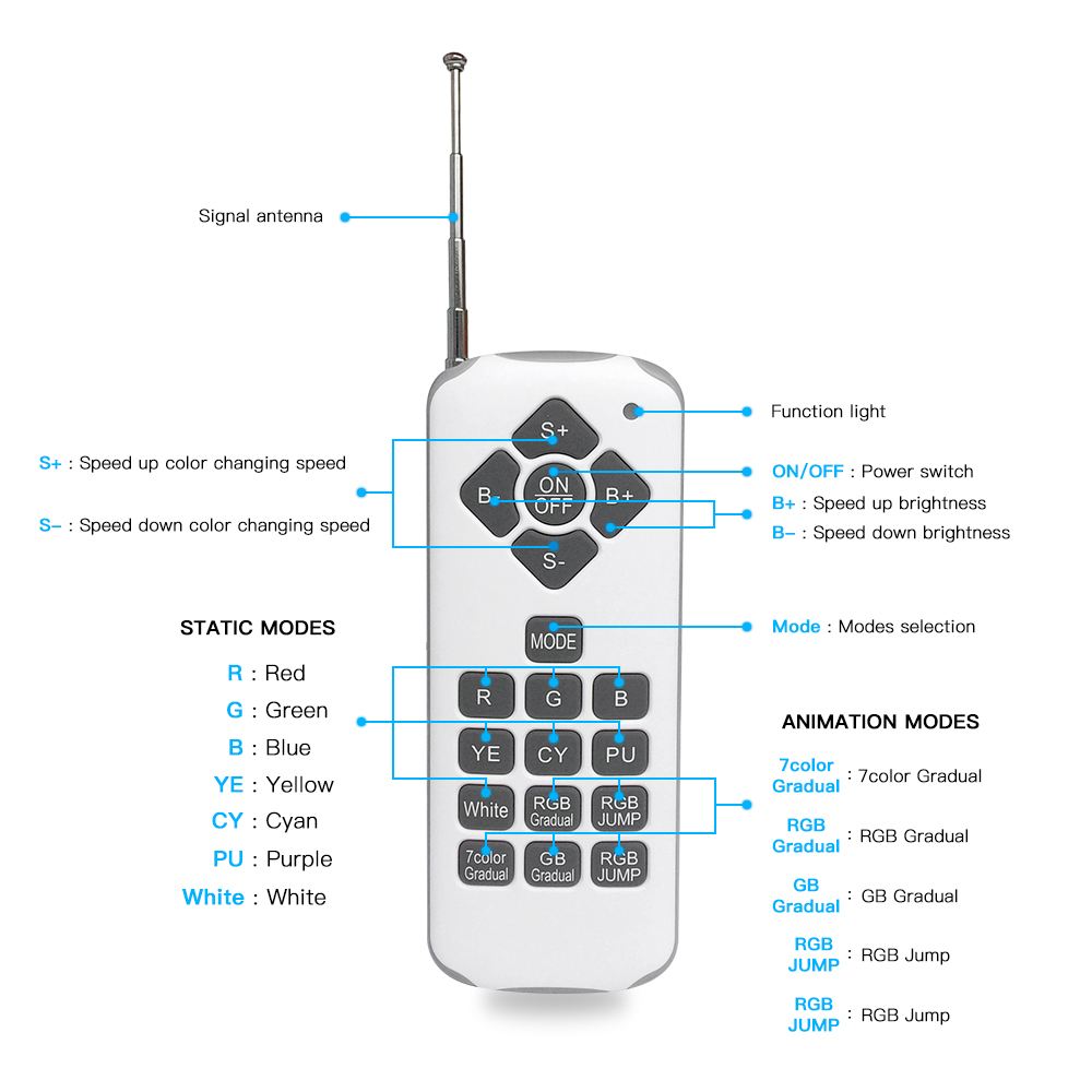 - Support remote control and switch control(Repeatedly turning the bulb on and off to change the color mode.) Note: The remote control needs to buy a battery (Search for "12V 23A"). If the bulb is installed underwater more than 3 feet or the bulb is sealed in an all-metal fixture, the signal will be greatly attenuated or lost.