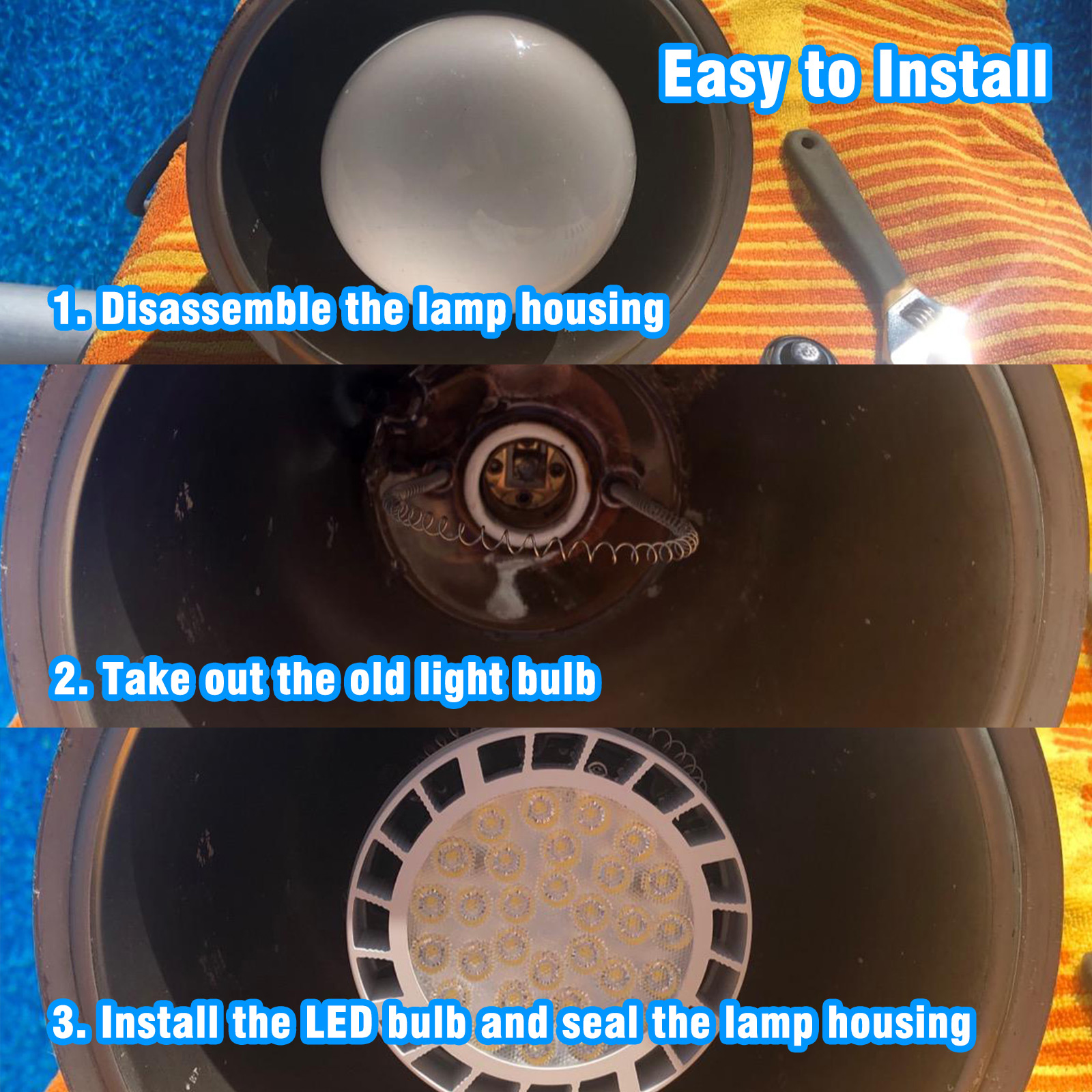 - Bulb Dimensions: 3.74*4.72Inch, Medium base (E26), Unscrew the old lamp to replace the LED bulb, Compatible with Pentair Amerlite 789 790 791 series, Hayward Astrolite SP058 series etc, the lamp supports AC/DC 12V input.
