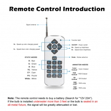 - No remote control around, No problem! The color mode of the pool bulb can also be changed by switching the power supply. Note: The remote control needs to buy a battery (Search for "12V 23A"), If the bulb is installed underwater more than 3 feet or the bulb is sealed in an all-metal fixture, the signal will be greatly attenuated or lost.
